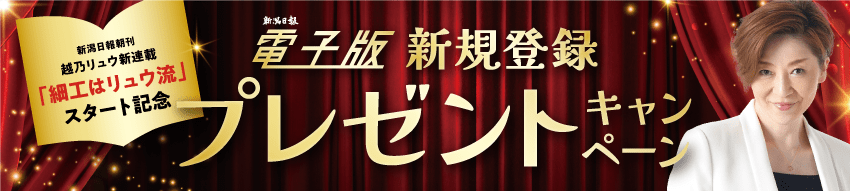 新潟日報デジタルアンバサダーでもある越乃リュウさんの連載スタートを記念して、期間中に新潟日報電子版を新規でご登録いただき、以下の条件でご利用いただくとオリジナルグッズを先着、または抽選でプレゼントいたします。