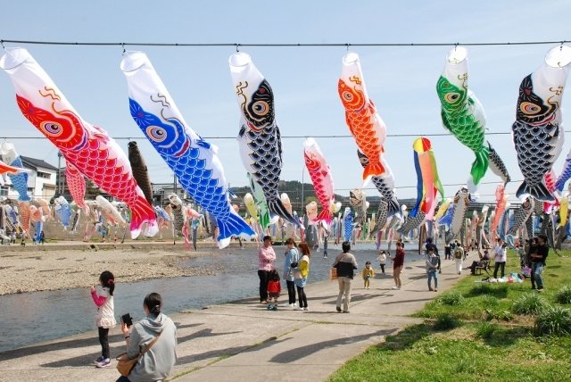 約500匹のこいのぼりが加茂川上空を泳ぐ