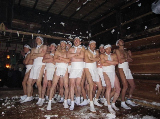 赤谷どんづきまつりは700年前から続く伝統ある奇祭。厄年を迎えた男衆が褌姿で激しく押し合う様は、勇壮で見るものを魅了する。押し合いも終盤を迎える頃、雪の塊を頭からかけられた男衆の熱気で極寒の時期にもかかわらず、湯気が立ち込め辺りを包み込む。