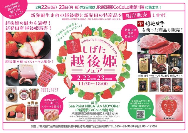 新発田市では、2月28日(土)から市内の菓子店や飲食店にて、新発田発祥のブランド苺「越後姫」を使った逸品が味わえるキャンペーン「いちご一会めぐり」が開催される。今イベントの開催を前に新潟駅CoCoLo南館1階にて採れたて越後姫や越後姫スイーツを中心とした物産展を開催。ブランド牛「新発田牛(うし)」加工品も販売予定。商品購入者は「いちご一会めぐり」スタンプラリー応募シールがもらえる。