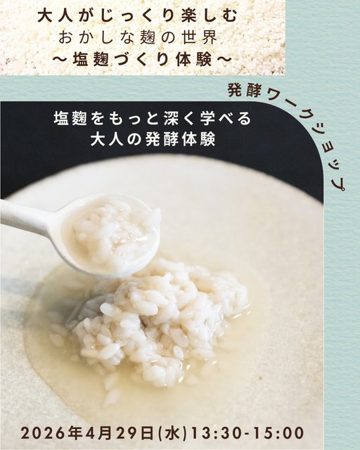 兵庫県丹波の人気麹屋「おかしなこうじや」の本間さんを講師に迎え、麹の魅力をより深く知ることができる、大人向けのワークショップ。麹の魅力を楽しく学びながら、実際の麹の食べ比べで新しい発見も。家庭での活用方法や美味しい使い方など、日常に活かせるヒントも紹介する。麹の力を活かした発酵調味料『塩麹』づくりを体験できるほか、麹を使ったプリンやキッシュ、鶏肉料理の試食も楽しめる。