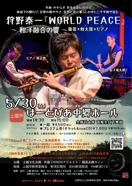 狩野泰ー『WORLD PEACE』 〜和洋融合の響〜 笛×和大鼓×ピアノ(上越市)