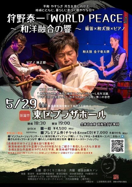 狩野泰ー『WORLD PEACE』 〜和洋融合の響〜 笛×和大鼓×ピアノ(新潟市)