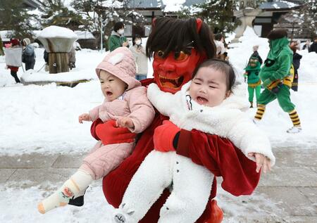 節分の3日、三条市西本成寺1の本成寺で伝統の「鬼踊り」が行われた。人間の醜い心を表しているという5色の鬼を、集まった人は豆を投げて...