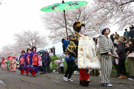 [動画あり]まるで大河ドラマの世界…燕市で「分水おいらん道中」 満開の桜と時代絵巻、観客魅了