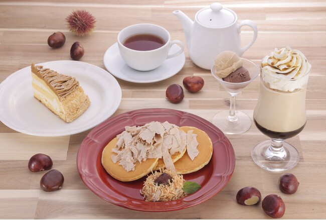マロンスイーツ&ドリンク。どこから食べてもマロンバターが香るパンケーキや渋皮マロンアイスが入ったほうじ茶ラテが新登場
