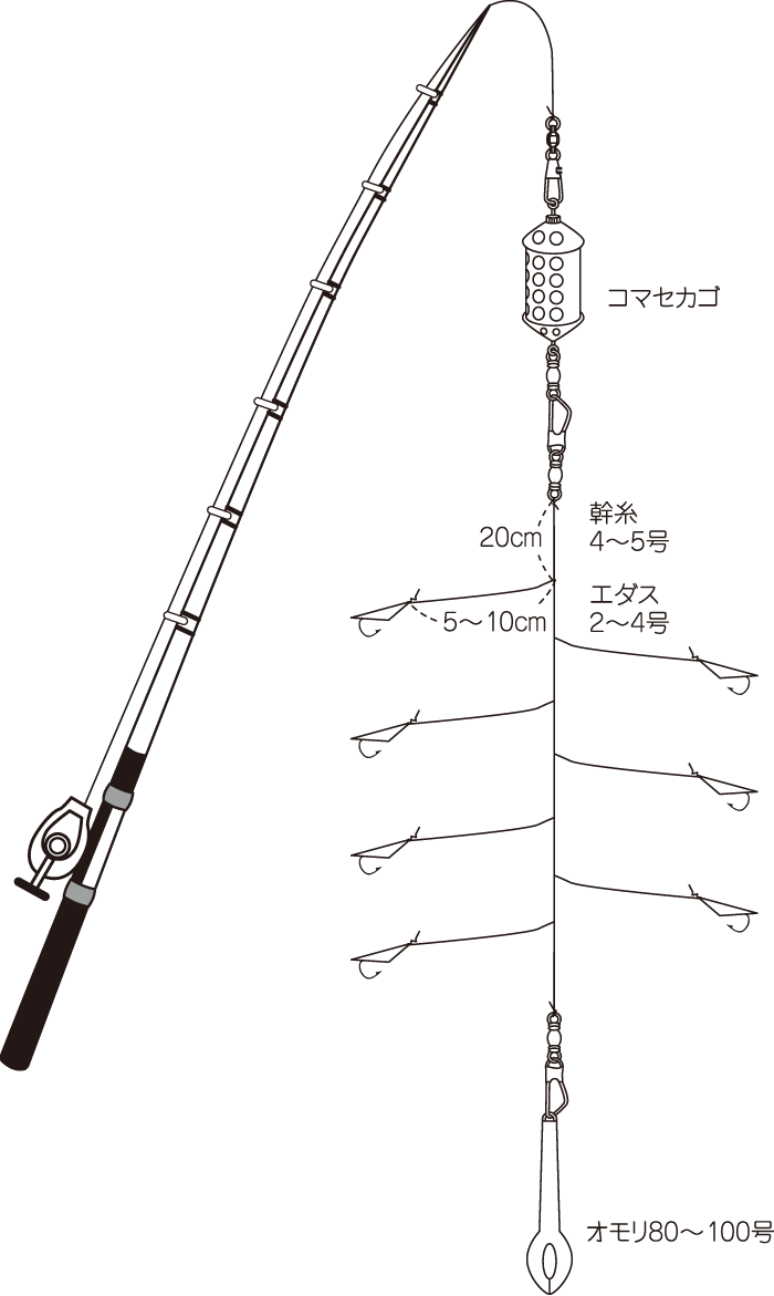 - 食いの悪いときはオキアミやイカの短冊の紅ぞめ、イワシをサビキ仕掛けの2~3カ所に付けると良い。