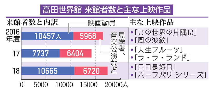 話題作の上映は当然、客足への影響が大きい。16年度はアニメ「この世界の片隅に」が動員を押し上げた。17年度は1万5千人を割ったが、18年度は昨年亡くなった名優、樹木希林さんの出演作の数々が人を呼び込んだ。