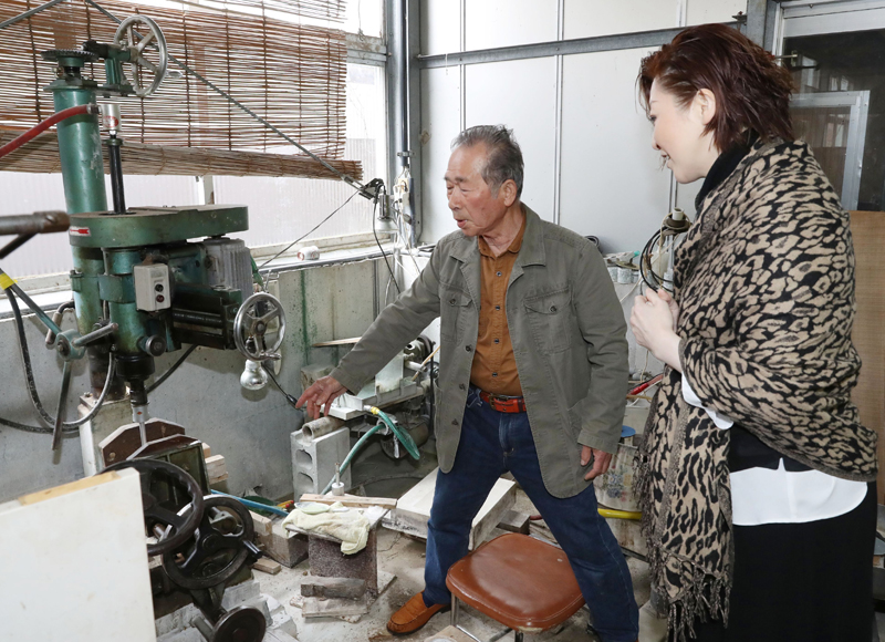 通常の作家が練り込みで使い分ける粘土の色は約10種類というが、山岸さんは「カップ1個でだいたい180種類の粘土棒をまず作ります」。削り出していく際に半分近い粘土が無駄になると聞き、リュウさんは「えー、もったいない」と驚きながら、境目が分からないほど繊細な濃淡の模様を見つめた。