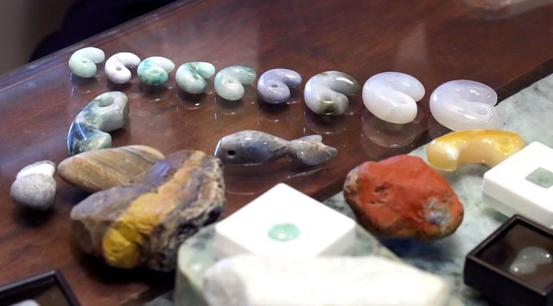 龍見さんが糸魚川産ヒスイで加工した勾玉。さまざまな色がある(翡翠工房)