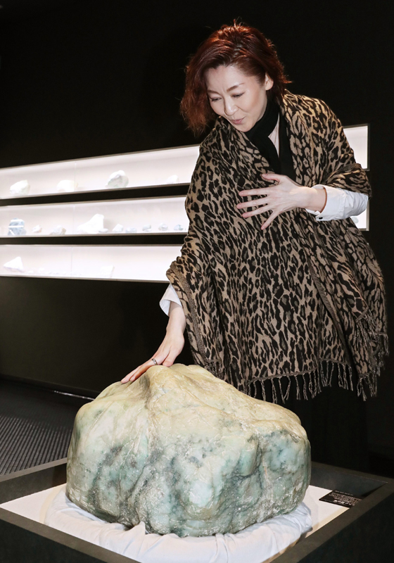 フォッサマグナミュージアムでヒスイの巨石に触れるリュウさん。「吸い込まれそうな緑色」と圧倒されていた=糸魚川市一ノ宮