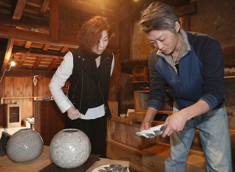 「手間が掛かってますね」と、練り込み技法で繊細な模様を表現した山岸丈訓さん(右)の作品に見入るリュウさん=糸魚川市西中の和楽窯
