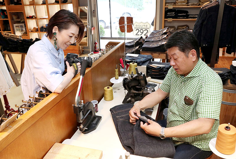 裾直しには、1950年代に製造されたビンテージミシンを利用。リュウさんは「1本に込める手間と愛情がすごいですね」と、西脇さんの手さばきにくぎ付けになっていた=写真=。
