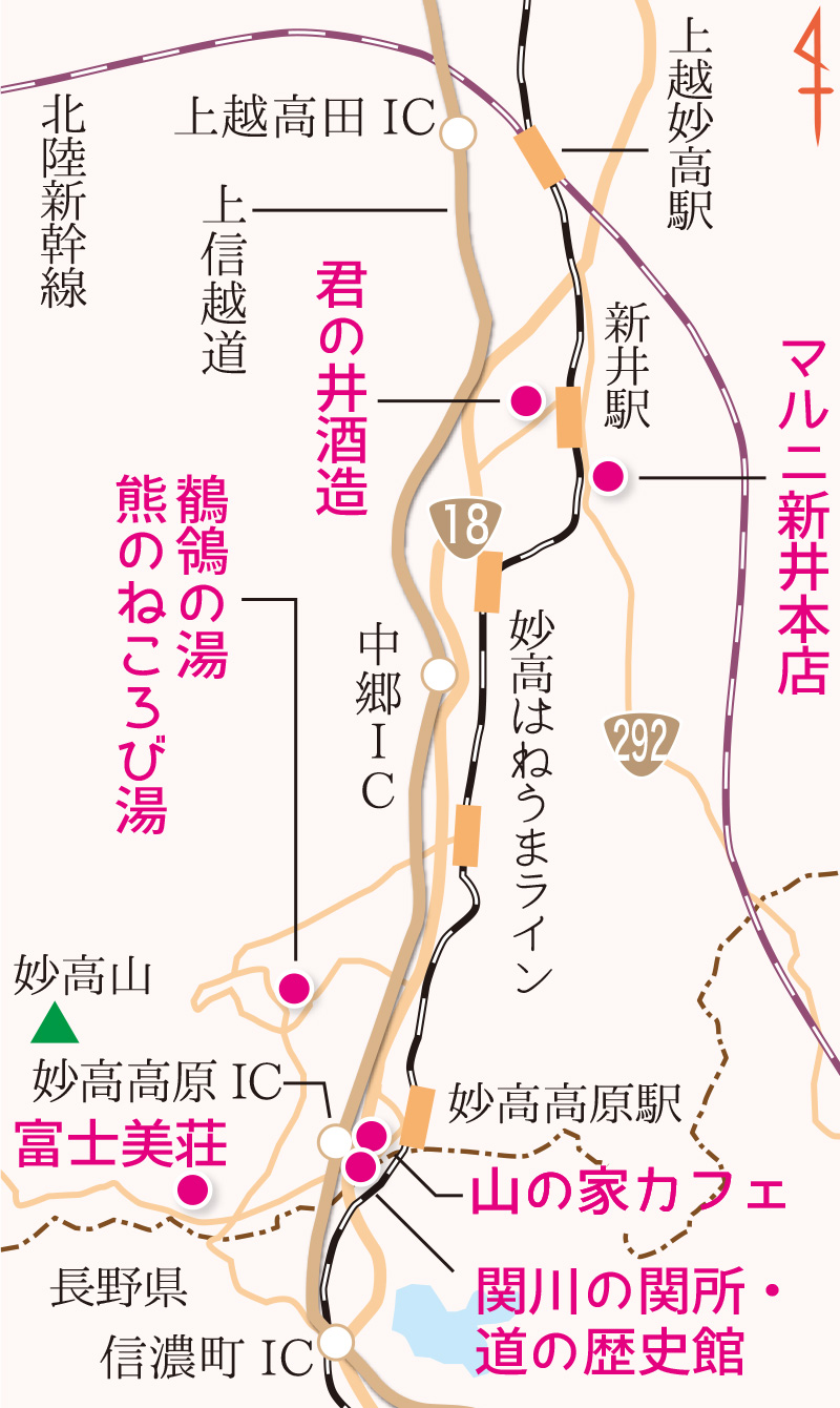 旧北国街道を上越市方面に下ると、かつて多くの旅人が羽を休め、にぎわいを見せた新井宿のエリアに入る。通り沿いには1842(天保13)年創業の酒蔵「君の井酒造」の社屋があり、趣を今に伝えている。