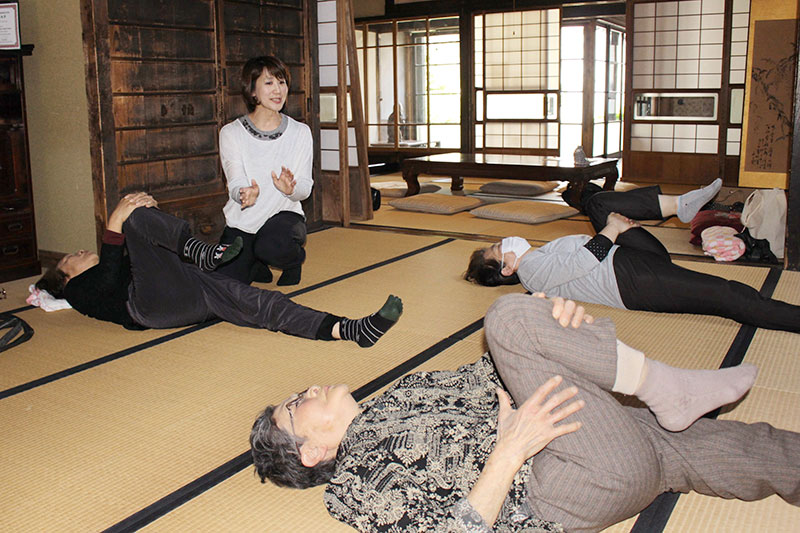 体操は全てあお向けになったままできる比較的簡単な動き。片方の膝を両手で抱えて胸に引き寄せたり、あばら骨付近から腕を上方に伸ばすイメージで背伸びをしたりする動きを指導してもらった。畳の上で早速実践すると、心地いい痛みとともに体がすーっと軽くなった感じ。他の参加者からも「関節がよく動くようになった」と喜びの声が聞かれた。