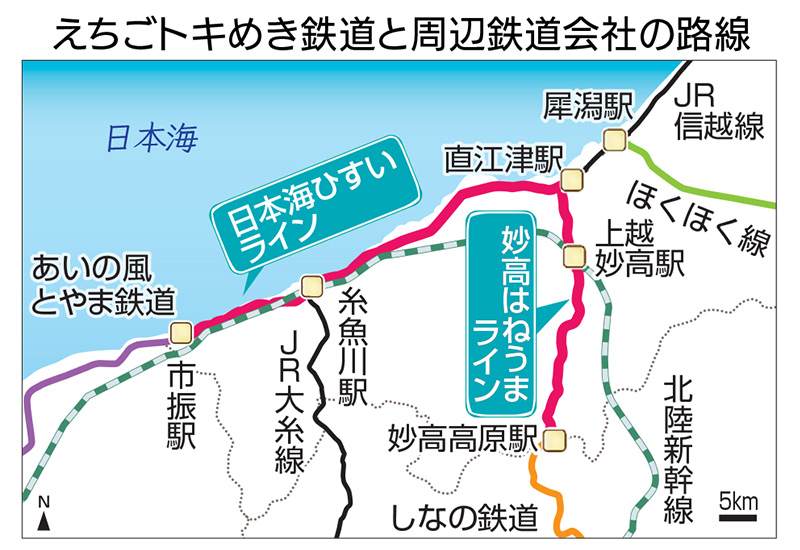 <えちごトキめき鉄道> 2015年3月14日の北陸新幹線の長野-金沢間の延伸開業に伴い、JRから経営分離された並行在来線の信越、北陸両線の一部を引き継いで開業した鉄道会社。県や上越、糸魚川、妙高3市などの出資で「県並行在来線株式会社」として10年11月に設立され、12年7月に現在の社名となった。本社は上越市。旧信越線の直江津(上越市)-妙高高原(妙高市)間の37.7キロを「妙高はねうまライン」、旧北陸線の直江津-市振(糸魚川市)間の59.3キロを「日本海ひすいライン」として運営している。