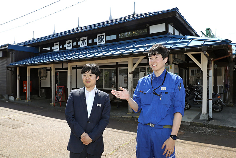二本木駅の前に立つ横田大輝さん(左)と須田直樹さん。「駅自体に価値を付けることで人が来てくれる」と話す=上越市中郷区