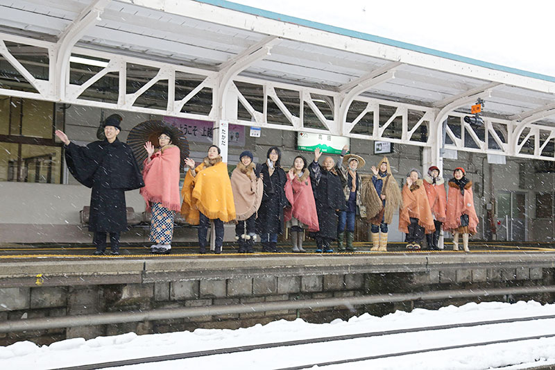 トンビや角巻を着て、高田駅で雪月花の乗客を迎え入れる「雁木のまち高田おもてなし隊」のメンバーら=2018年2月、上越市