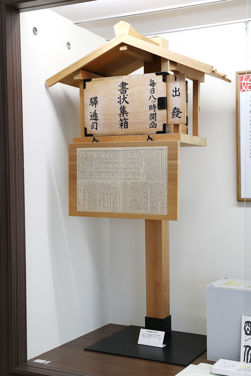 雨よけの屋根が付いた「書状集め箱」(模造品)と呼ばれたポスト。箱のモデルは江戸時代の目安箱という説がある=前島記念館所蔵