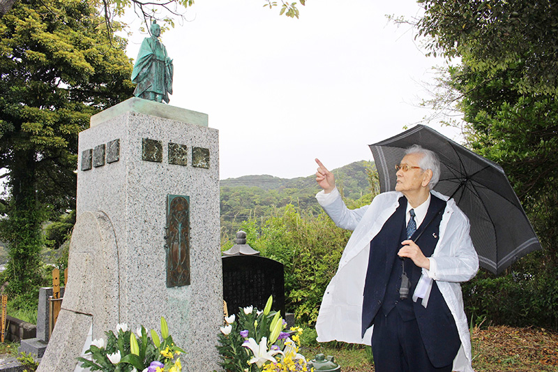 墓前で前島密の功績を語る吉崎庄司会長=2019年4月、神奈川県横須賀市の浄楽寺
