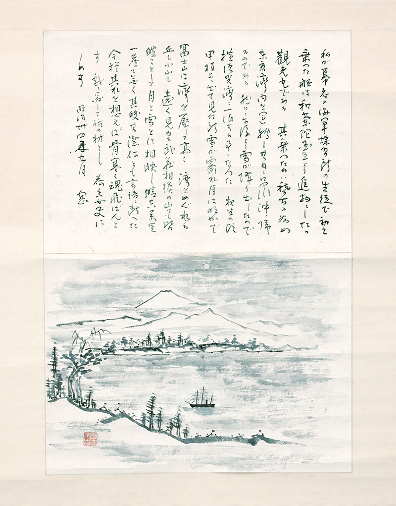 1901(明治34)年、密は長女に絵文を贈った。青年期に乗船した幕府の軍艦「観光丸」から見た富士山を描いている。