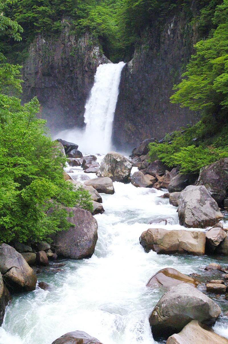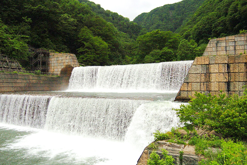 「日本の滝百選」苗名滝へ向かう。右手に関川砂防