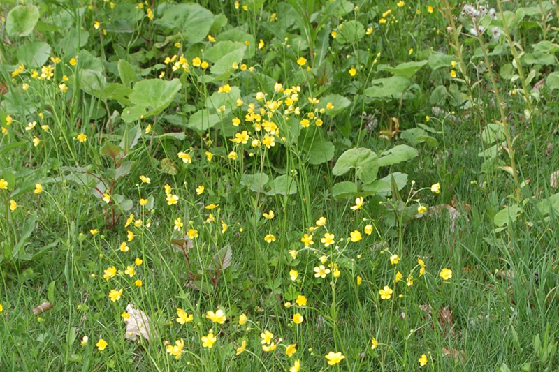 笹ケ峰牧場では5月末、牛の放牧が始まった。4月末に30センチの積雪があったといい、訪れた6月初めはキンポウゲはまだ咲き始め。ハイキング姿の人たちに話を聞くと、湧き水「宇棚の清水」を汲みにきたという。