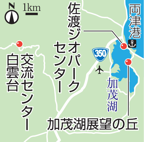 いざ最初の目的地へ。両津地区の加茂湖を見下ろす加茂湖展望の丘に立った。加茂湖も山からの土砂の流出で砂州が伸び、海から隔てられたことで形成されたとされる。湖の面積は東京ドーム約100個分。「えっ、そんなに!?」。五十嵐夢羽さんは驚きの声を上げた。