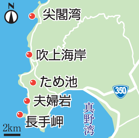 「弁慶のはさみ岩」で有名な吹上海岸では、目玉模様の付いた石を見つけた。約1800万年前の火山活動でできた