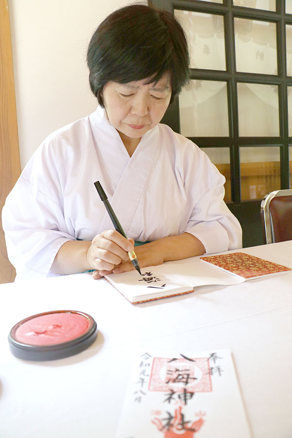 「参拝への感謝と、書かせてもらってありがたいという気持ちで日々、向き合っています」。南魚沼市の八海神社では、宮司の村山みね子さん(56)が一枚一枚、心を込めて筆を走らせ、御朱印を書いている。県内でも数少ない女性の宮司だ。