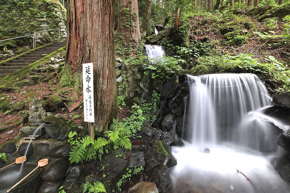 秋山郷の入り口に位置する、見玉不動尊(津南町)。境内は山の斜面にあり、本堂へと登る、急な石段の脇を、清水が7段の滝となって勢いよく流れ落ちる。一帯は真夏でもひんやりとした空気に包まれ、豊かな清水が水田を潤してきた。