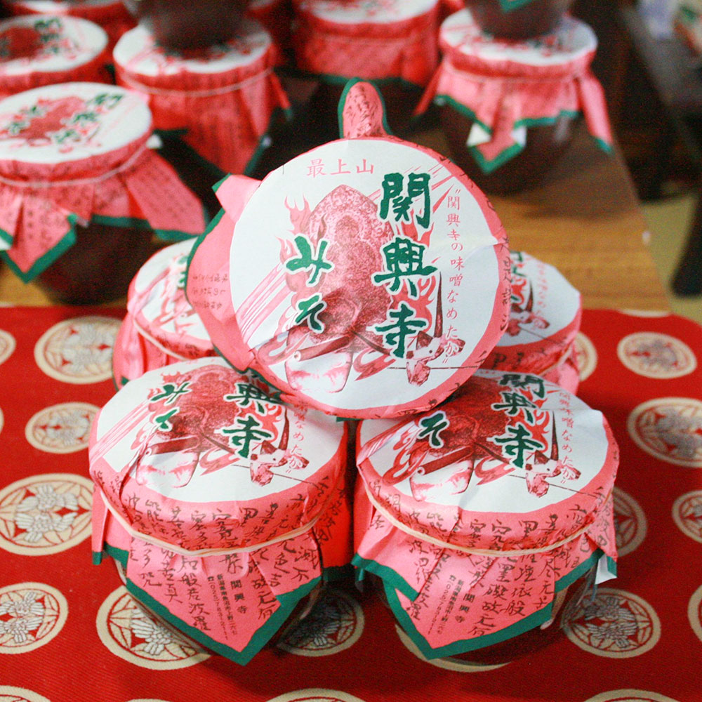 関興寺は戦国時代、上杉謙信没後の家督争いによる戦火でお堂などが焼失した。だが上杉家寄進の経文は桶の中の味噌に埋められていて難を逃れたとされる。その後「(経文を守った)ありがたい味噌」として寺の名物となった。関興寺味噌は試食もでき、1個500円。