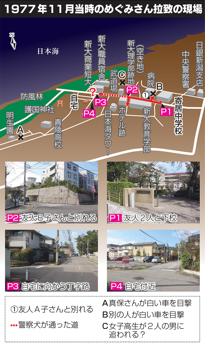 42年前のあの夜、めぐみさんの臭いをたどって警察犬が捜索したが、自宅に近い道路周辺で途絶えた=図P3=。この付近で拉致されたとみられている。「この辺りで拉致されたんだよ」と正樹さんが言うと、大和君は「おうちまでどれぐらい」と聞き返した。