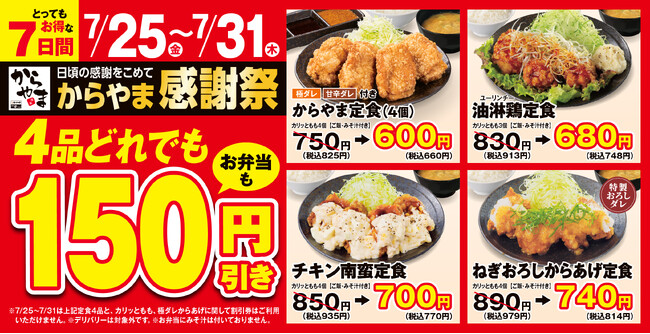 【夏もお得で応援】からあげ定食専門店「からやま」で人気の4品がお弁当も150円引き!