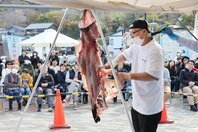 客前でアンコウつるし切り 出雲崎「天領の里」で汁を振る舞うイベント