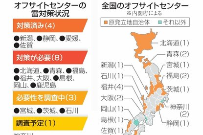 原子力災害が起きた際に行政や電力会社の拠点となるオフサイトセンターで求められている落雷対策について、センターがある16道府県のうち、少なくとも8道府県で対応が...