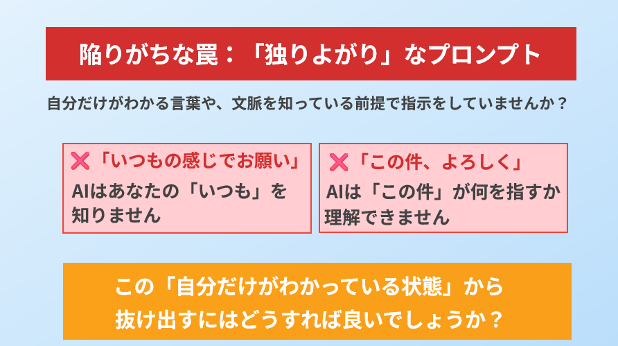 | 講座内容 | 【基礎編】プロンプト作成の基本的な考え方、ノウハウを、実践を交えてお伝えします。なぜそれが必要かを理解するために、生成AIの仕組みについても解説します ・生成AIとは何か ・「自己責任」でAIと向き合う ・キーワードは「言語化」と「意識化」 ・あいまいさを取り除く基本の書き方 ・意図を盛り込む工夫で回答の質向上 ・指示と手順のひと手間でさらにレベルアップ 【実践編】的確なプロンプト作りを支える「言語化」のプロセス、AIが嘘をつく「ハルシ ネーション」を防ぐための具体策などを学び、事前にいただいた「お題」を基 に、実際に生成AIを使ってプロンプト作成の演習を行います ・「言語化」の3つのプロセス ・「独りよがりなプロンプト」に陥らないために ・「WHY」がもたらすプロンプトの変化 ・AIの「もっともらしい嘘」(ハルシネーション) ・ハルシネーション防止の具体策 |