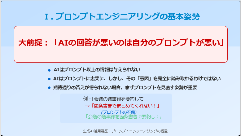 「良いプロンプト」を知ることは、業務効率化の早道です。未来を創るビジネスパーソンの土台となる、知恵と知識を身につけませんか。(講座は有料。内容、時間はカスタマイズできます)