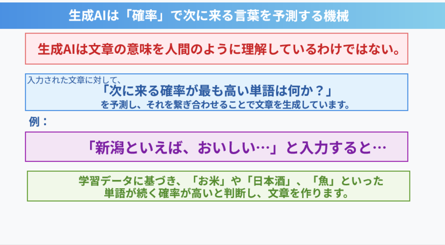 | 所用時間ほか | ・基礎編、実践編ともに90分程度。時間、内容等はご事情に合わせてカスタマイズいたします。実践編を受講する場合、講座で取り組む「お題」を事前にヒアリングさせていただきます ・確実に知見を広げるためには、基礎編、実践編セットでの受講をお勧めします。2つの講座を一日で行うことも可能ですし、複数日に分けることもできます。 ・講座ではノートパソコンまたはタブレット端末を受講人数に合わせてご用意することを推奨いたします。会場ではインターネット環境が必要です。 ・新潟日報生成AIのスポット利用も可能です。お問い合わせください。 |