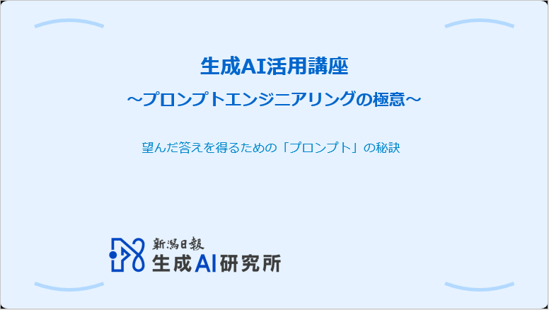 講座内容 | 【基礎編】プロンプト作成の基本的な向き合い方、ノウハウをお伝えします ・「自己責任」でAIと向き合う ・キーワードは「言語化」と「意識化」 ・あいまいさを取り除く基本の書き方 ・意図を盛り込む工夫で回答の質向上 ・指示と手順のひと手間でさらにレベルアップ 【実践編】実際に生成AIを使ってプロンプト作成の演習を行い、講師が解説します ・意図を盛り込む ・指示の分割 ・ペルソナを与える ・手順の提示 |