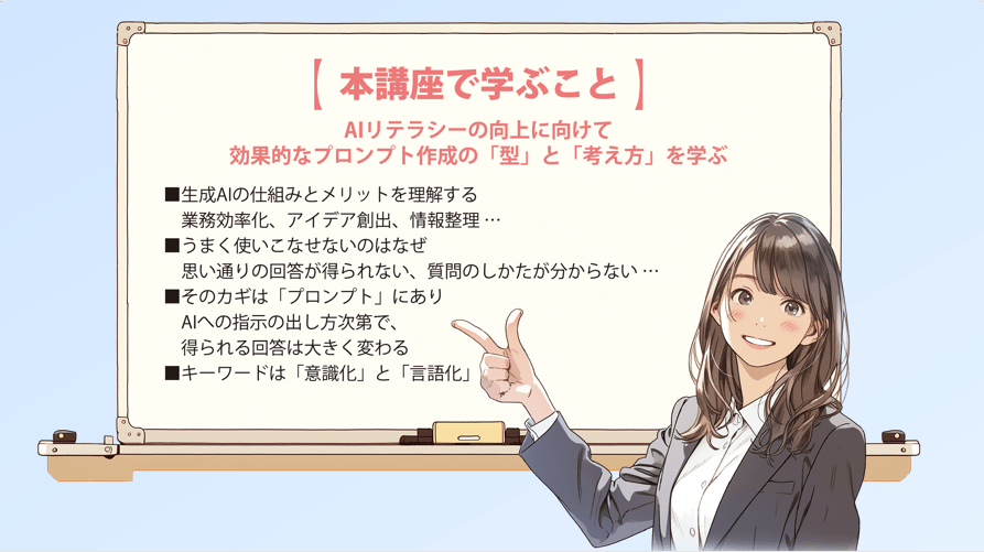 生成AIは、使う人が入力するプロンプト(指示)に従って動きます。どのようなプロンプトを作るか。それがAIを使いこなす最大のカギとなります。 プロンプトは「言葉」です。この講座では、「言葉のプロ」として 豊富な経験を持つ元新聞記者が、プロンプト作りのコツをアドバイスし、併せてAIリテラシーの向上を図ります。