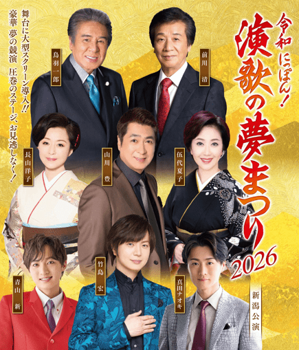 前川清や鳥羽一郎、山川豊ら8名の演歌歌手が豪華共演する「令和にっぽん!演歌の夢まつり2026」新潟公演を開催します。人気と実力を兼ね備えたスターたちによる圧巻のステージをお見逃しなく。
